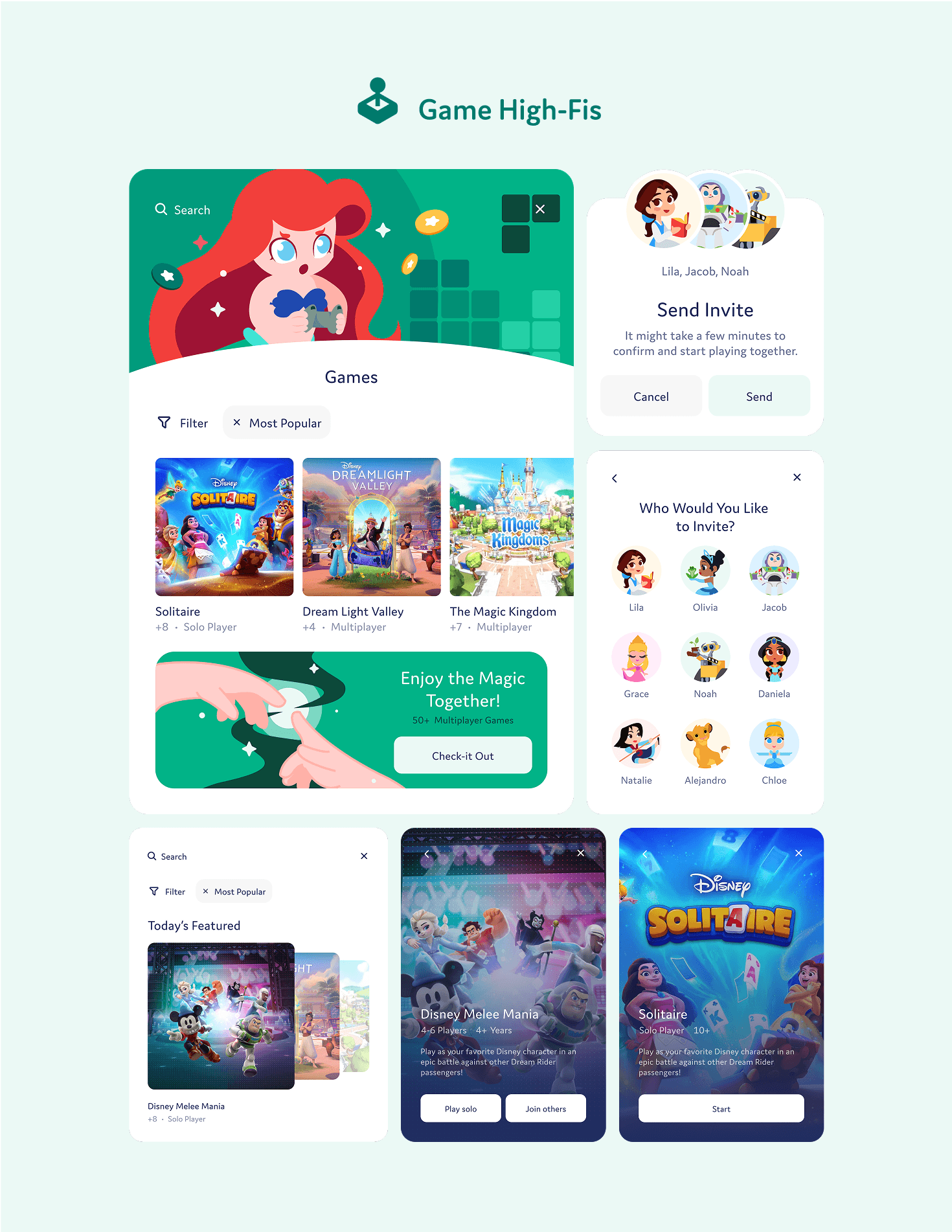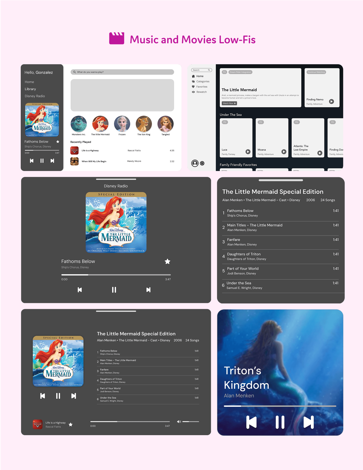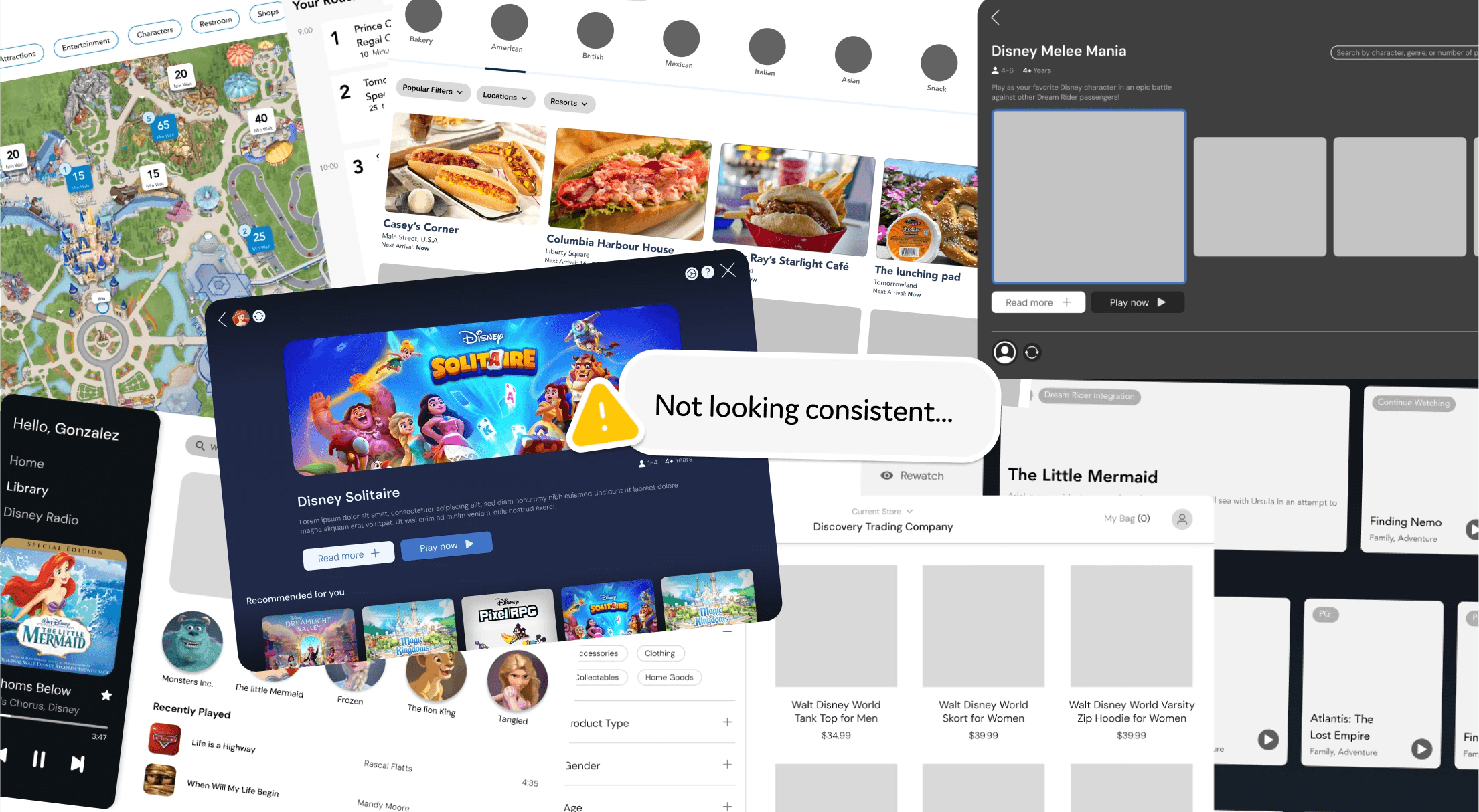 Then, we jumped into Figma to begin developing the table’s visual identity. This required extensive iteration. Initially, we drew UI inspiration from popular platforms: Disney+ for entertainment, Spotify for music, DoorDash for food, Google Maps for navigation, and major retailers for shopping.