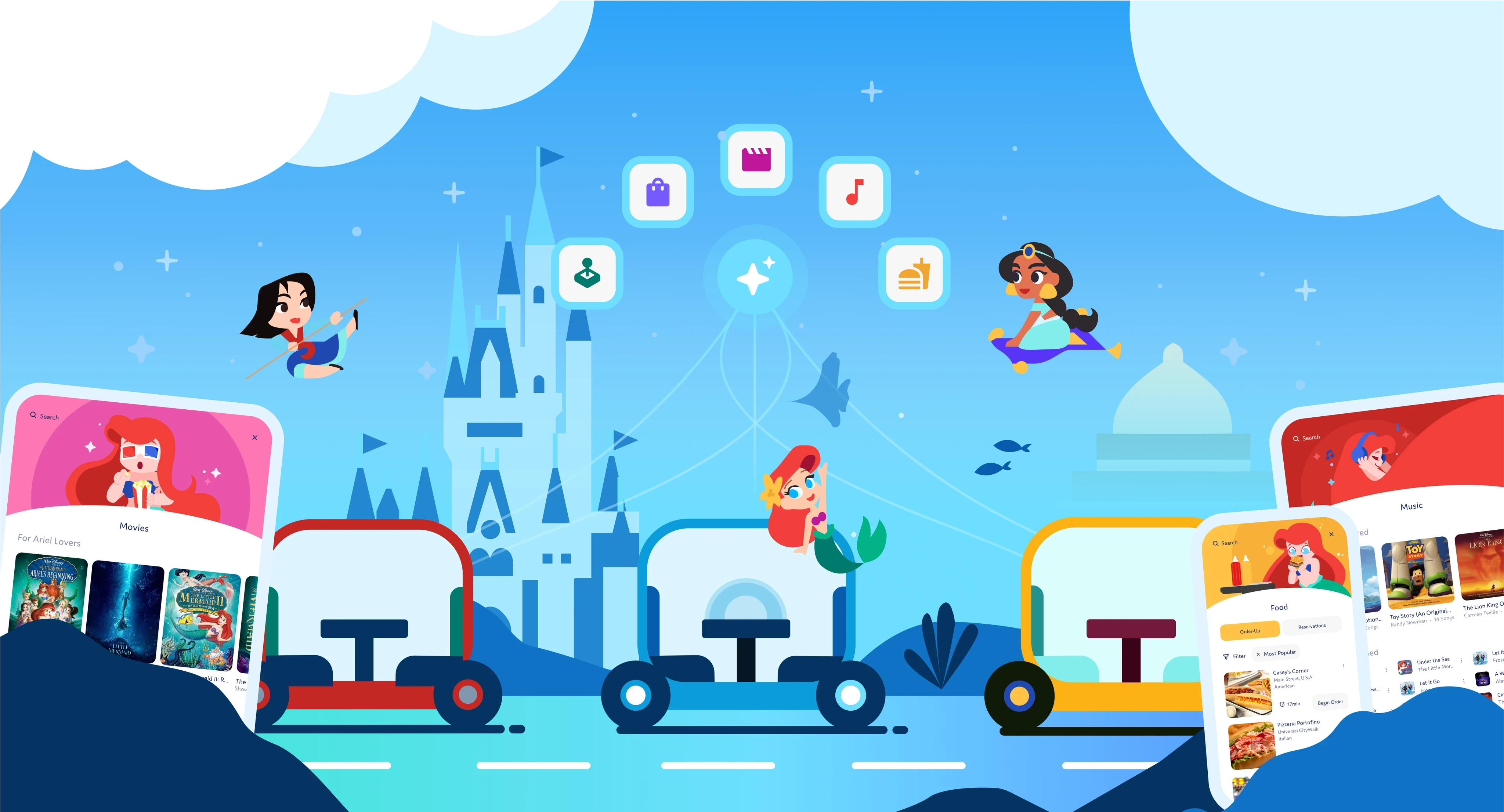Movies, songs, games, shopping, and dining features enhance the park experience.